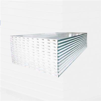 采用硫氧镁为芯材,镀锌或彩涂板为面层(两层) 及高强度粘剂,通过高速连续自动化成型机加温、加压复合,经过修边、开槽、下料而成的新一代建筑装潢板材。具有防火性能强、硫氧镁彩钢夹芯板憎水率大于98%,遇水不发生变形和化学反应,强度高夹芯板长度可达到10m承受两个成年人踩踏,保温隔音效果好。